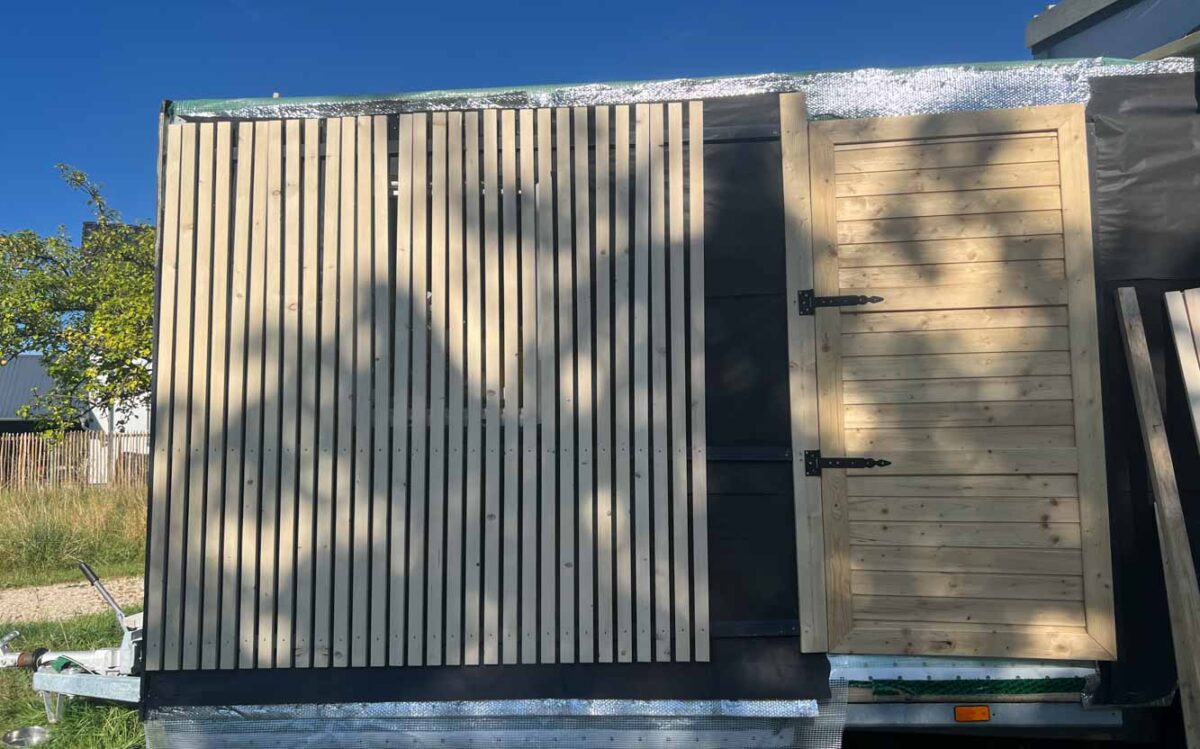 Dazu kommt das, was ich gerade schon als letzten Schliff bezeichnet habe. Die baldigen Tiny House Bewohner stehen mit ihren Häusern draußen in einer Art Wagenburg. Sie Schrauben, Sägen und Werkeln an ihren Traumhäusern. Auch wenn jeder sein Haus baut, das ein oder andere geht alleine nicht oder ist schwierig. Dann hilft man sich und auch Alex packt mit an.